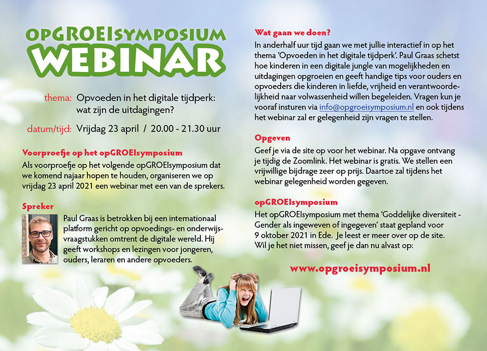 Op vrijdag 23 april hield Paul Graas een webinar over kinderen opvoeden in een digitaal tijdperk en welke uitdagingen daar bij komen kijken. Hij ging in op deze vraagstukken en gaf handige tips voor ouders en opvoeders die kinderen in liefde, vrijheid en verantwoordelijkheid willen begeleiden naar volwassenheid.