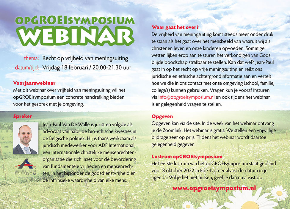 Op vrijdag 18 februari hield Jean-Paul Van De Walle van ADF International een webinar over de vrijheid van meningsuiting. Met dit webinar wil het opGROEIsymposium een concrete handreiking bieden voor het gesprek met je omgeving.
